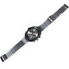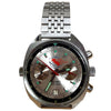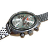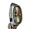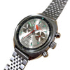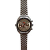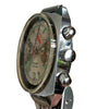 The watch features a P3133 chronograph, originally issued to all pilots in the Soviet era and favored by Soviet and Russian cosmonauts. It is a Sturmanskie chronograph, a model issued to employees of the State Bank. The dial has a rotating bezel on the outer circumference and a tachymeter inside. The crown on the left side is for the rotating bezel and can be moved left and right.