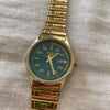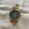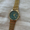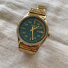 SEIKO 5, gold/green color, analog/hand-wound type with date display, made in Japan.