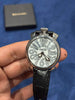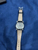 Silver quartz watch with an Arabic numeral dial and leather band.