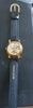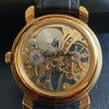 Gold-colored wristwatch with a see-through dial and hand-wound mechanism.