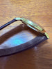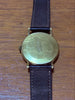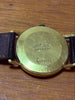 Analog hand-wound watch with a gold case and dial.