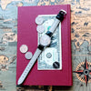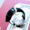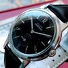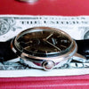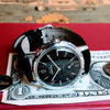 This is an Elgin antique wristwatch with a cool black dial. The crystal has thin scratches, but the band has been replaced with a new one.