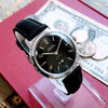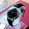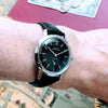 The band is black leather with a lug width of 0.63 inches and a wrist size of 5.12 to 7.09 inches.