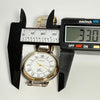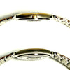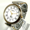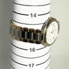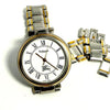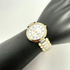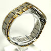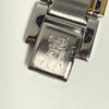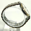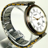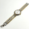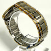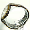 The watch has a silver and gold color scheme and is made of stainless steel.