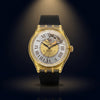 Automatic winding analog wristwatch featuring a clear case and yellow dial with Roman numeral indexes.